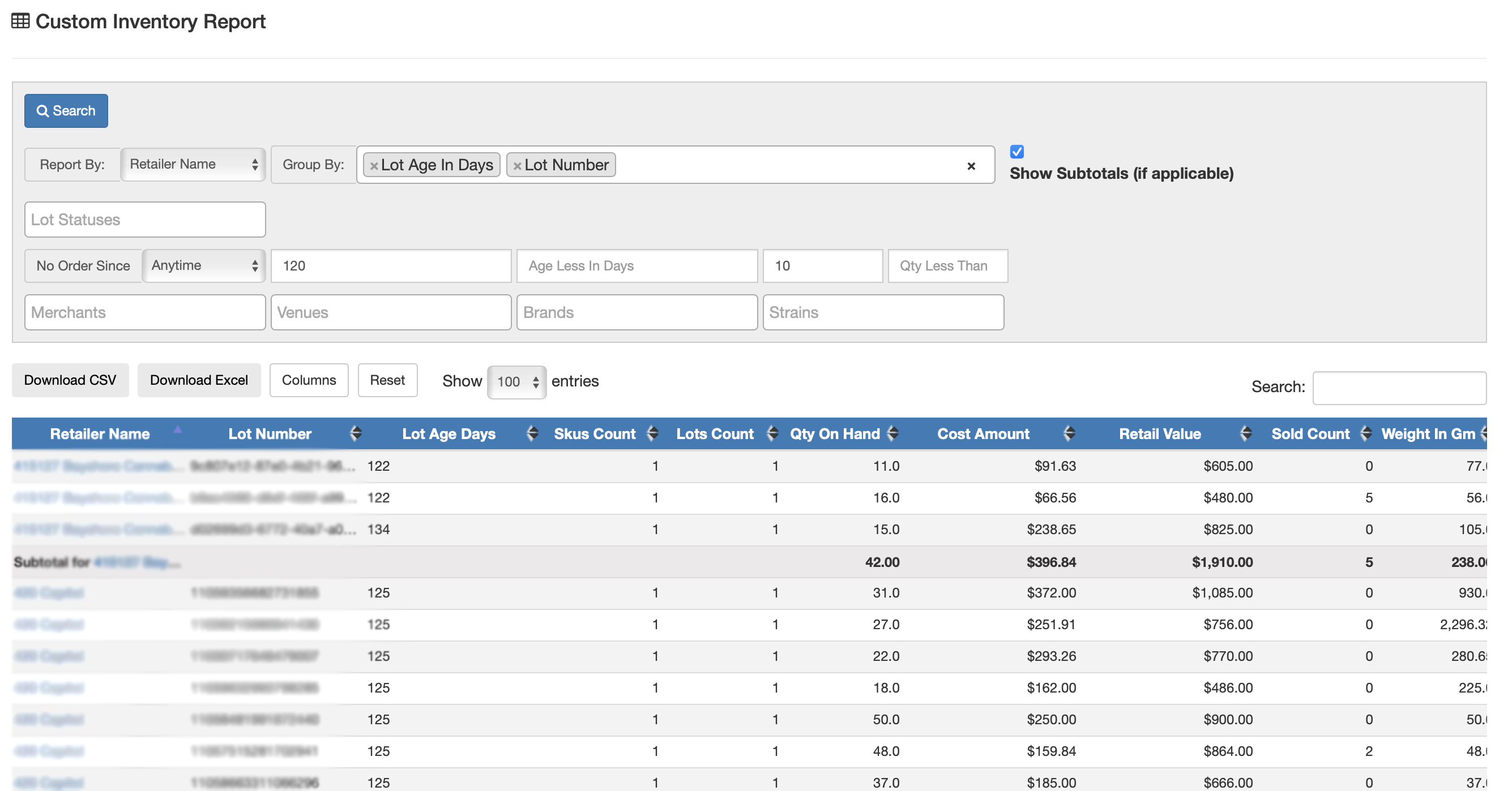 Inventory by Retailer Name and Lot Age in Days by Lot Number