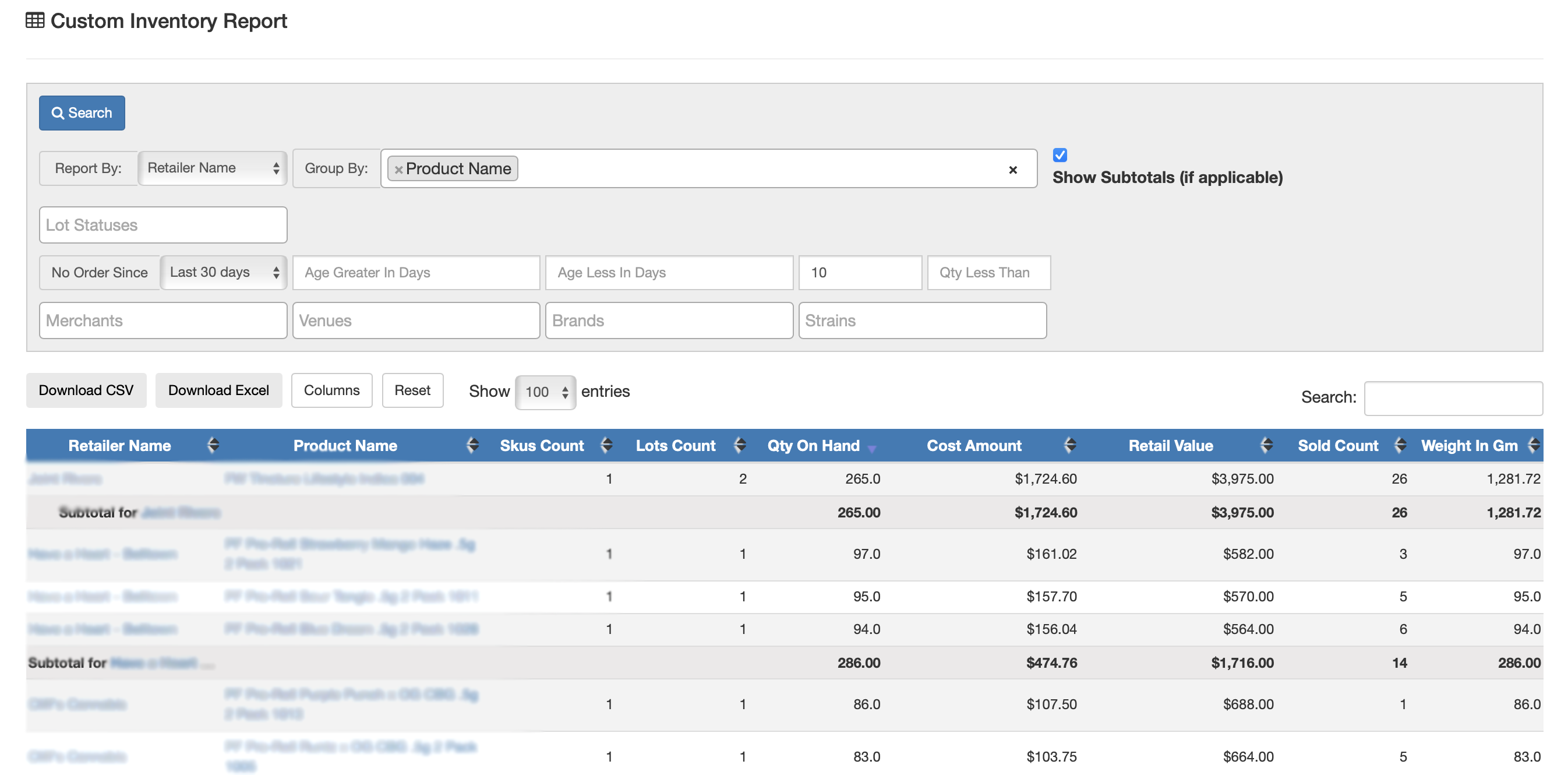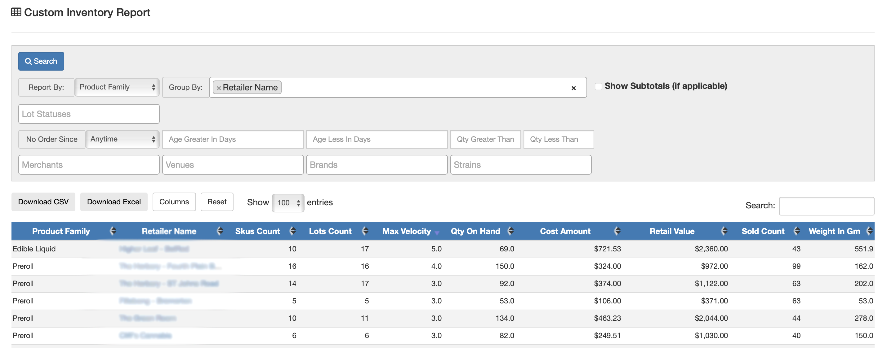 - This report shows inventory levels by product family (e.g., flower, prerolls, concentrates) at each retailer location. Brands can use it to compare category performance across stores, identify which retailers need restocks, and adjust distribution strategies to meet demand.
