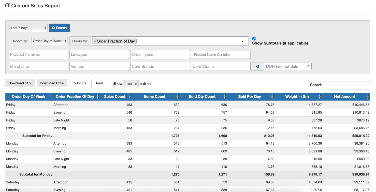 - Select date range, report by = order day of week, and group by = order fraction of day