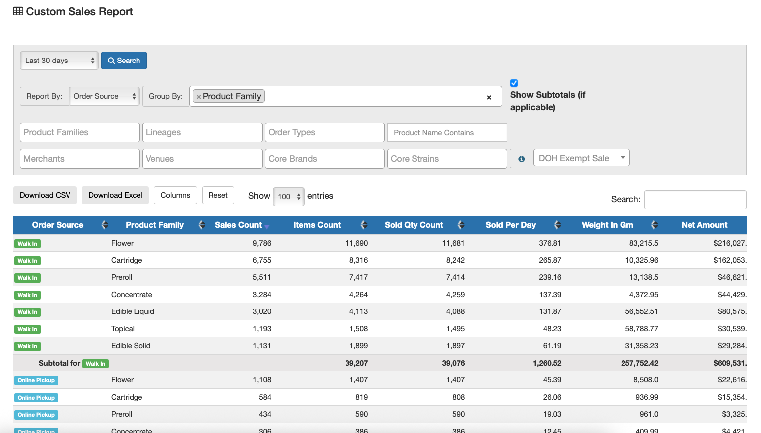- This report shows the break down of sales by product family for in-store (walk-in) and online pickup orders. These insights can be used to better understand shopping preferences, measure the impact of online ordering, and adjust product strategies or promotions to better support each sales channel.