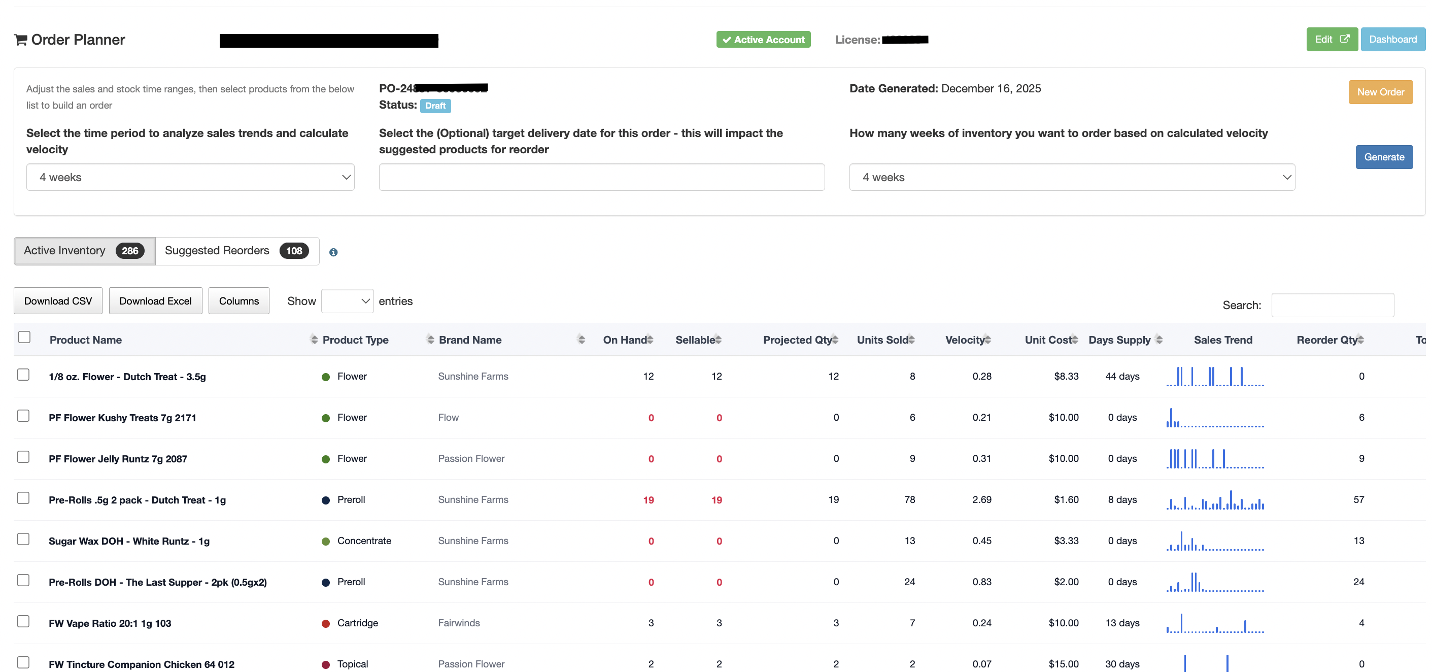 - Once you have generated the order, you will see a list of inventory below. You can see an assortment of data, including Product Type, On Hand count, sellable count, and some other valuable data. This information can help you understand what products the venue is likely to need more of. Select the box to the left of the product to add it to the order planner.
