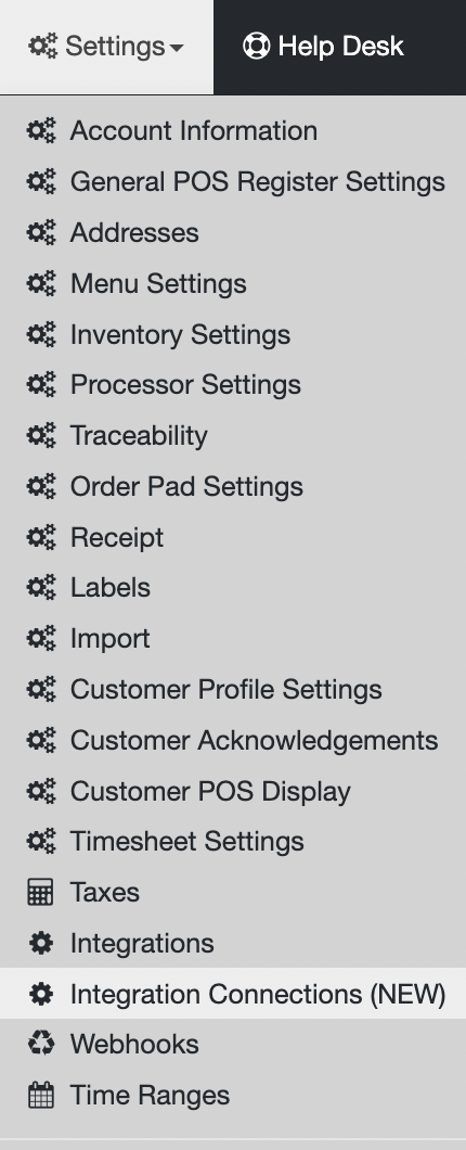 2. Navigate to the 'Settings' tab located at the top of the portal, then click on the dropdown menu and select 'Integration Connections (NEW)'.