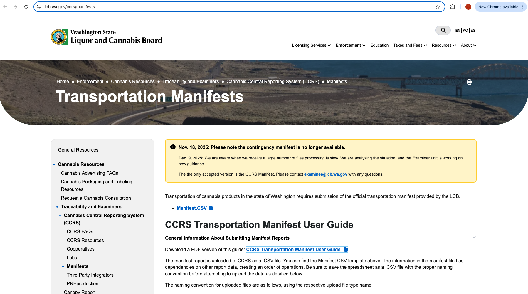 The contingency manifest is to be used if CCRS is unable to produce the required manifest for the movement of cannabis products within the I-502 market. When you complete the contingency manifest, the manifest must be sent to manifest@lcb.wa.gov. Once CCRS is working again, the license will need to submit the exact same information on a regular CCRS manifest. Any contingency manifest that is completed requires the license to still complete a regular CCRS manifest. The contingency manifest is primarily to assist with the transportation of cannabis and should not be used in place of the primary CCRS manifest.